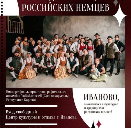 Уникальный коллектив российских немцев впервые представит своё искусство жителям Иваново в рамках юбилейных гастролей. Этнографический ансамбль «Volkskarussell» («Фольклорная карусель»), удостоенный звания «Народный коллектив самодеятельного художественного творчества Республики Карелия», приглашает всех на незабываемый концерт.