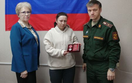 На снимке: Орден Мужества вручён супруге погибшего бойца В. В. Харламова.